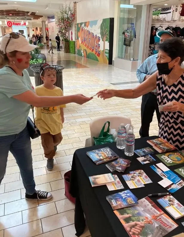 * Small teams of 2-4 typically stand near a full literature table (labeled with your church's info), & warmly invite passers-by to a free GLOW tract and/or the free table (full of free books, magazines, and study guides for all ages).